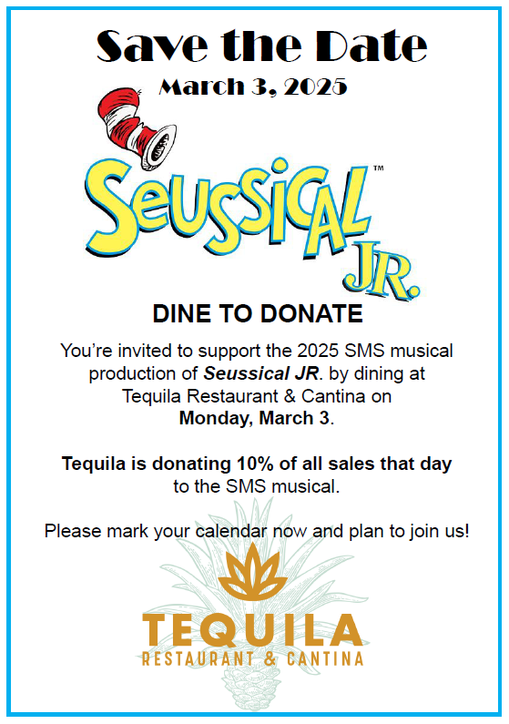 Please save the date for a restaurant fundraiser at Tequilas on Monday, March 3rd to help support the 2025 SMS musical production of Seussical Jr.